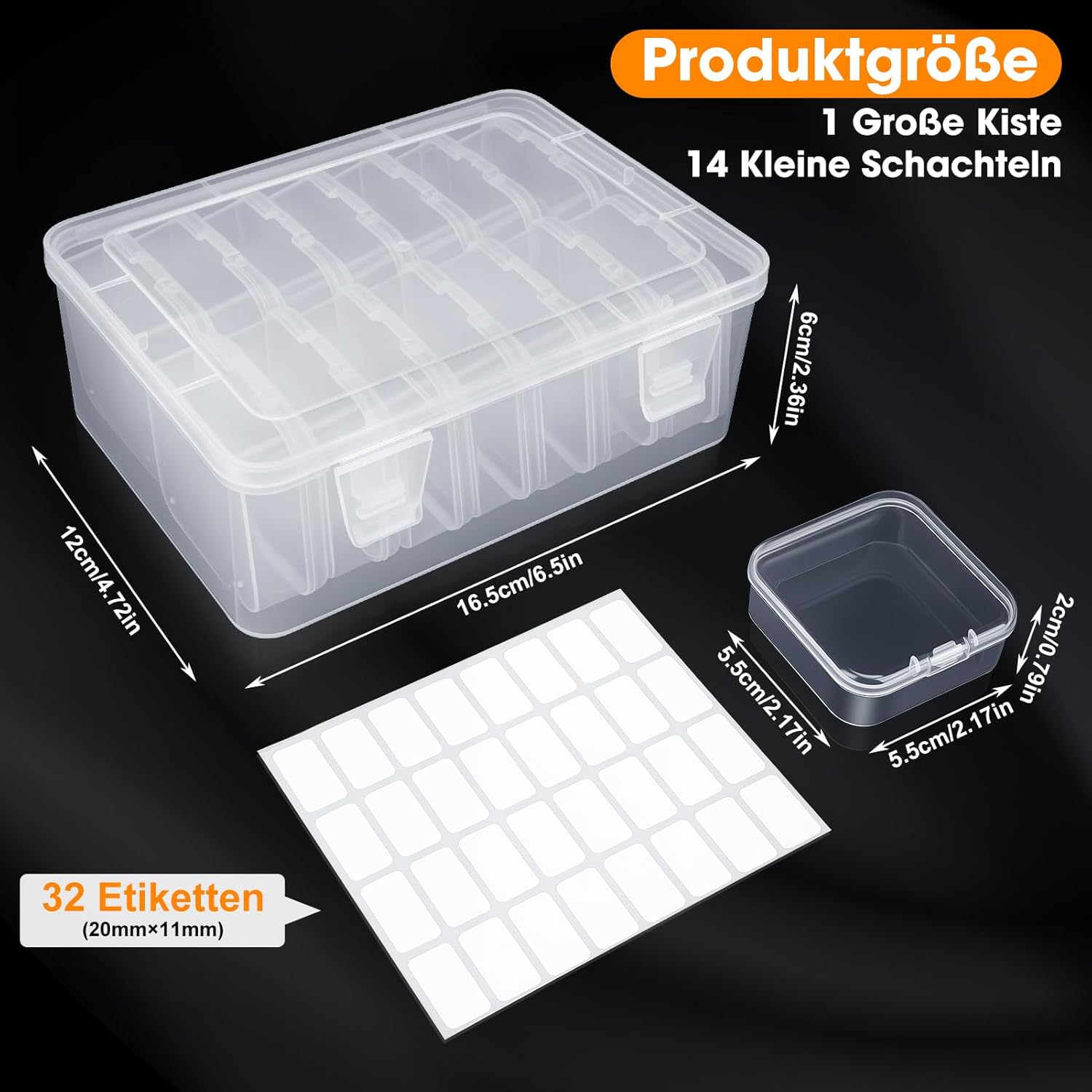 - Ideal choice for model makers 14 individual compartments + 32 labels. 5.5 x 5.5 cm compartments perfect for model components, miniature accessories and tools. Transparent design for quick finding – the must-have for hobbyists.