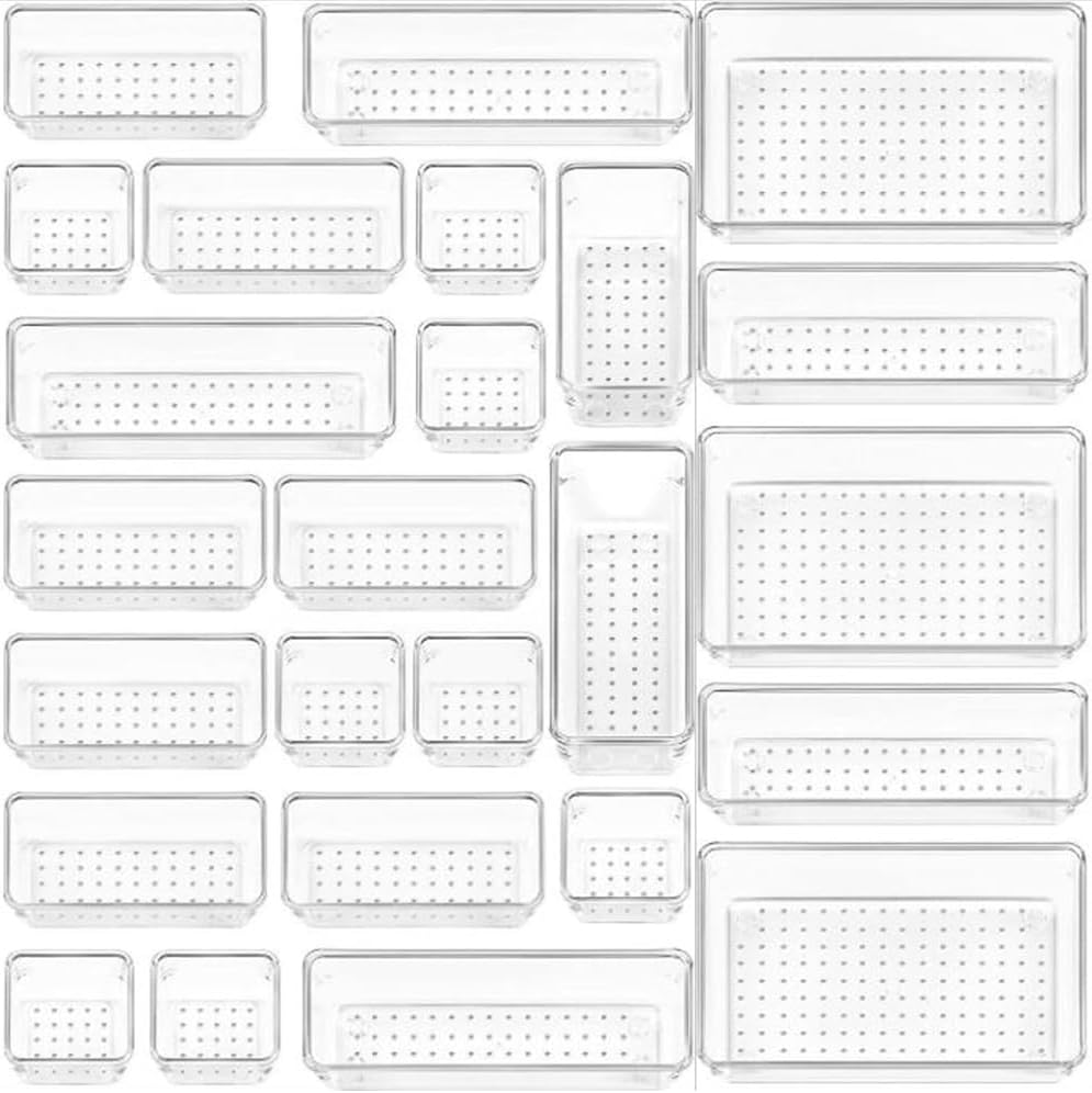 • 【Variable Combination】25-piece drawer organizer with 4 different sizes is available,meets different organisation needs and your space can be sorted easily. Size: 23 x 15 x 5.5 cm (3 pieces), 23 x 7.5 x 5.5 cm(6 pieces), 15 x 7.5 x 5.5 cm(8 pieces), 7.5 x 7.5 x 5.5 cm(8 pieces). Note: Cannot be used in the dishwasher.