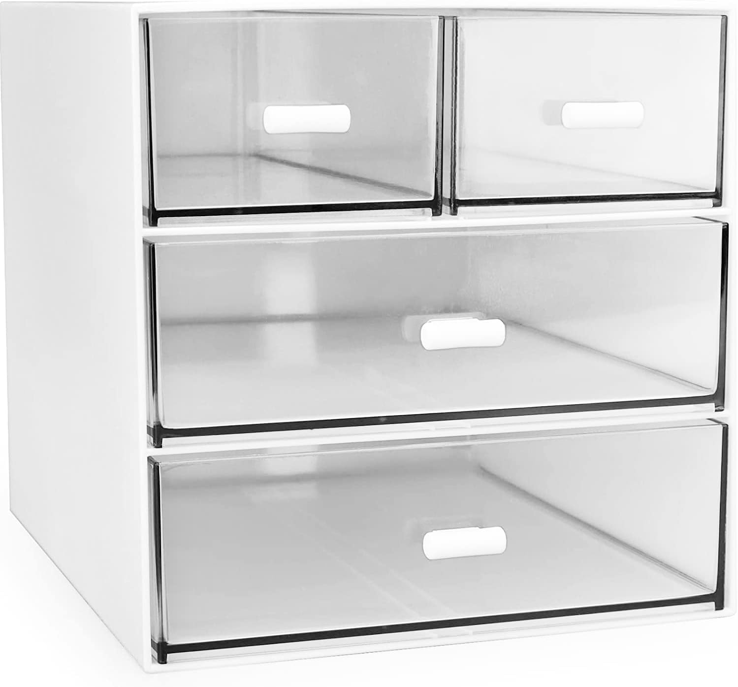 Desk Organizer with 4 Drawers, Makeup Organizer Desktop Organizer Bathroom Counter or Dresser Stackable Plastic Desktop Storage Box