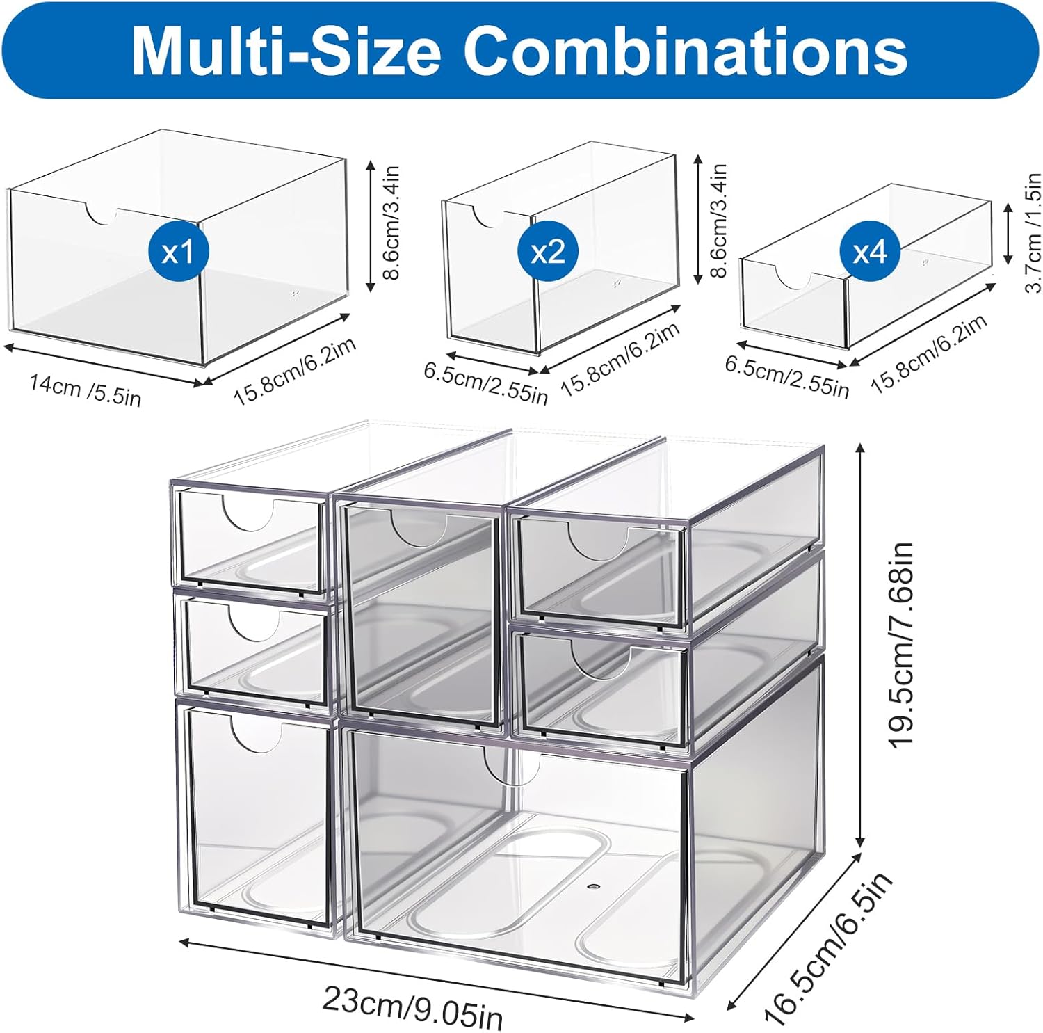 • 【Flexible Combinations】- Our Storage Drawers Set contains 1pc large drawer, 2pcs medium drawers and 4pcs small drawers, there are 7 drawers in total to satisfy your diversified storage needs, the dimensions are respectively: 2.55×6.2×1.5 in, 2.55x 6.2×3.4 in, 5.5×6.2×3.4 in. Each drawer is individual, you can use it independently or combine it freely to customize your storage in any way you want.