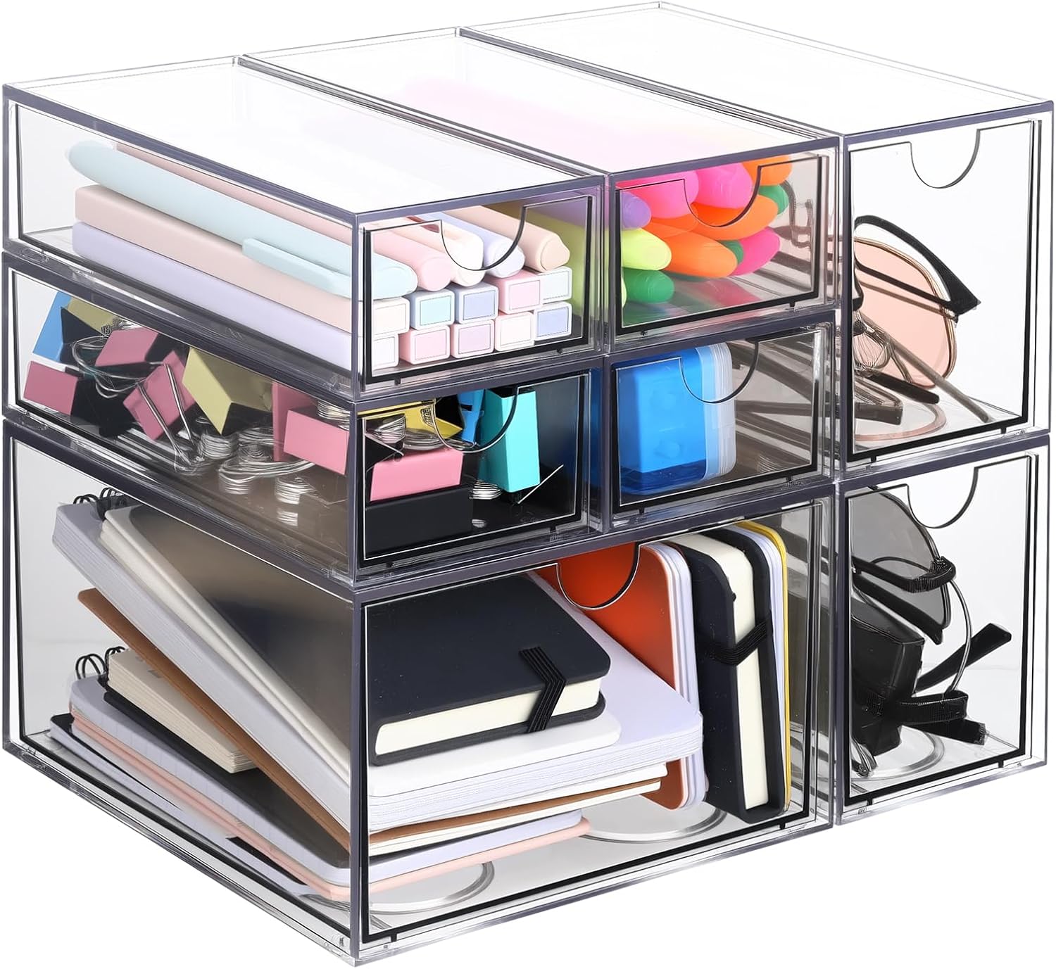 Desk Organizer with 7 Drawers, 7 Pack Acrylic Stackable Desktop Storage Drawers Makeup Organizer, Clear Craft Storage Box Cabinets for Office Vanity Countertop Bathroom Bedroom