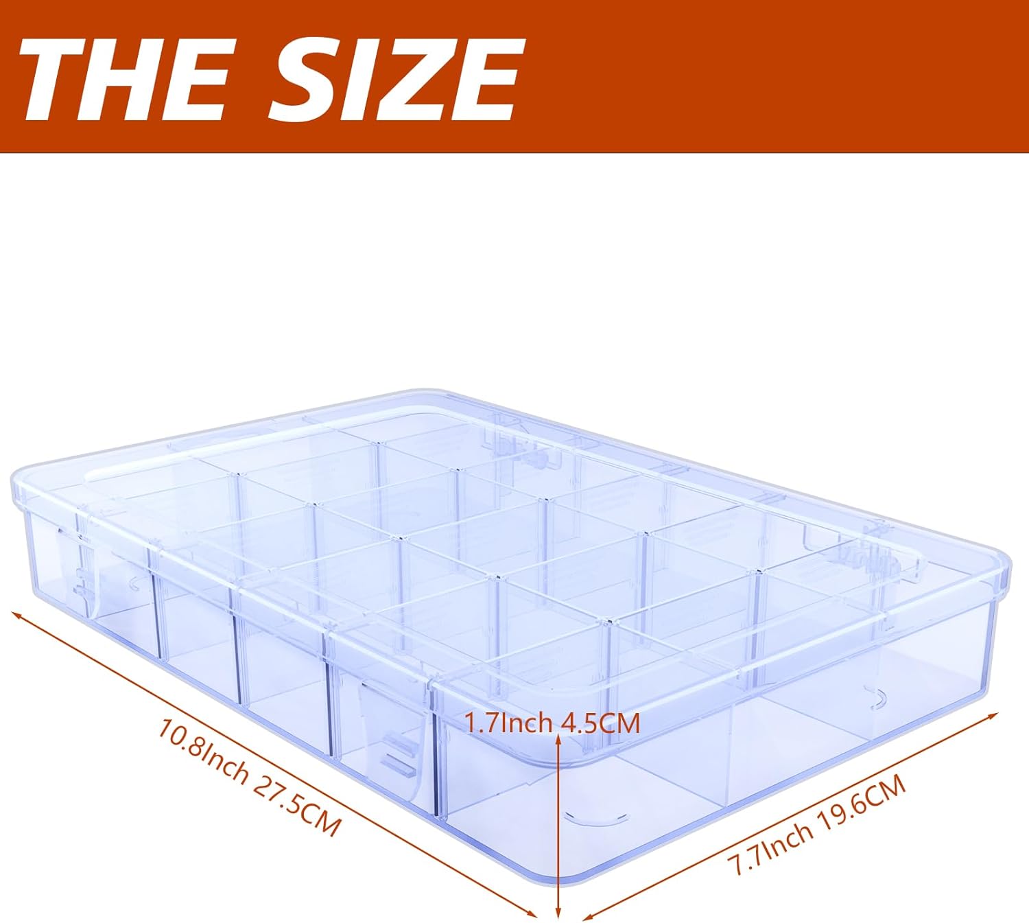 - Conveniently store your belongings with our Adjustable Clear Organizer Box/ Plastic Component Case, featuring 18 compartments! Measuring 10.8L x7.7Wx1.7H, it’s perfect for organizing jewelry, crafts, and more! Keep your small items organized with our 18-grid clear plastic storage box. It’s simple and practical, making it a must-have for any home or office.