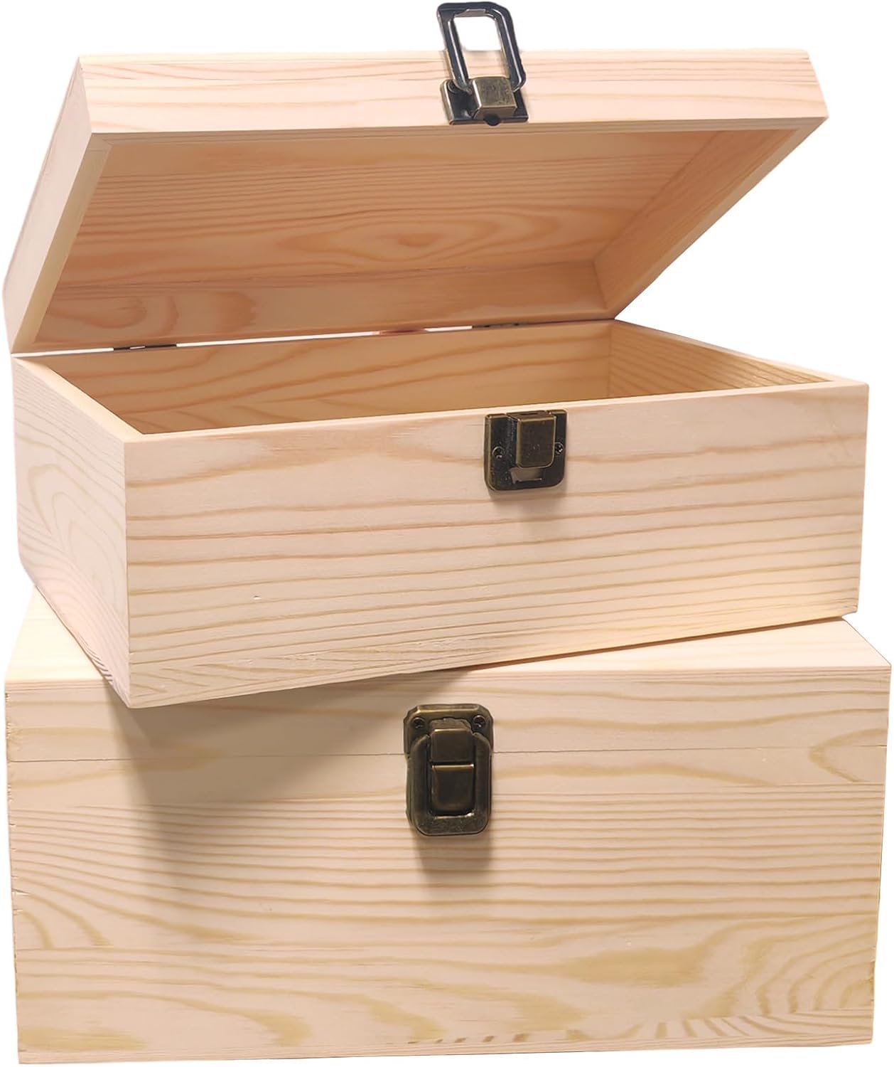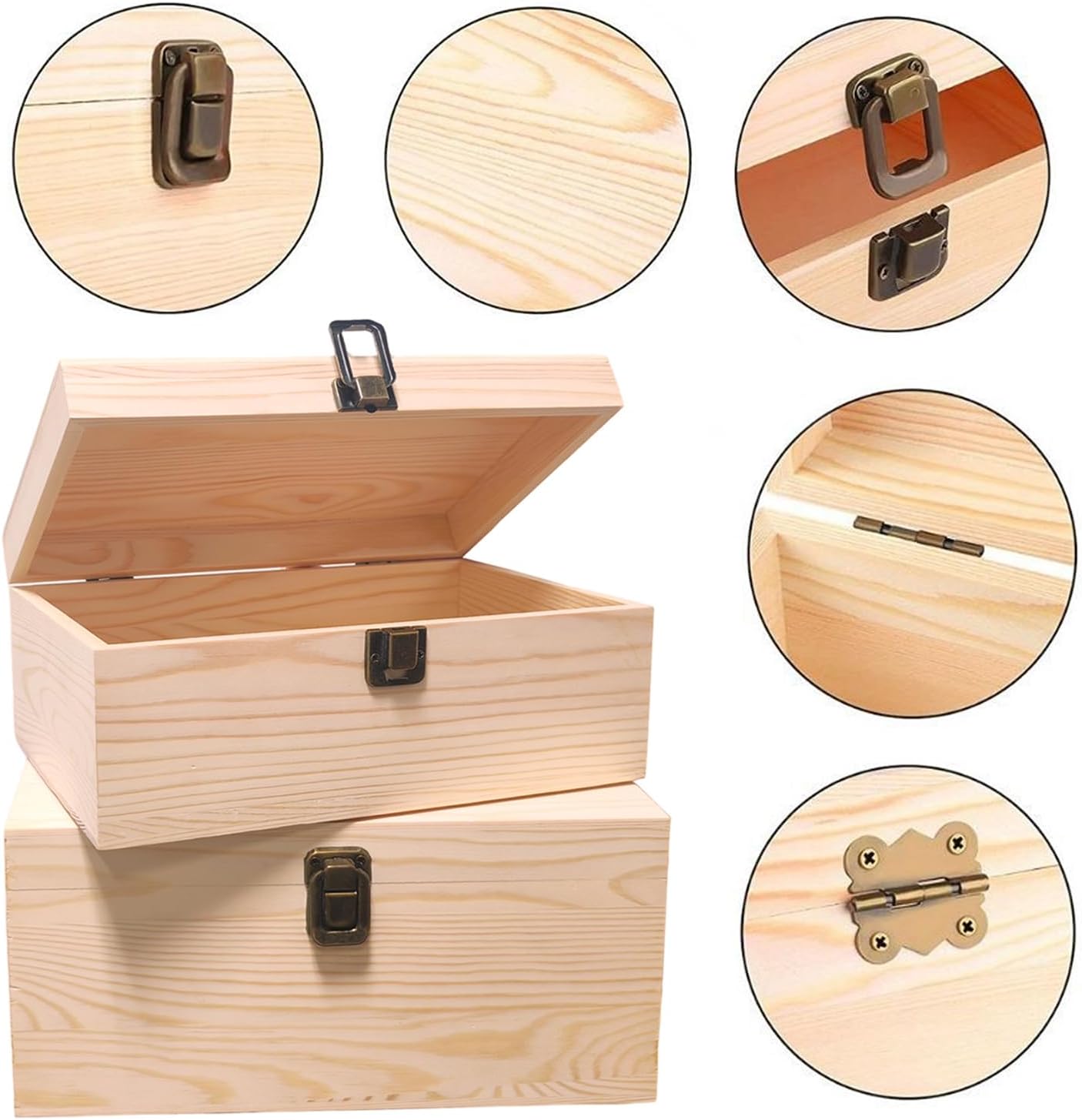 - Versatile Storage: Set of 2 natural wooden boxes with hinged lids and interior compartments, perfect for organizing crafts, jewelry, and art supplies